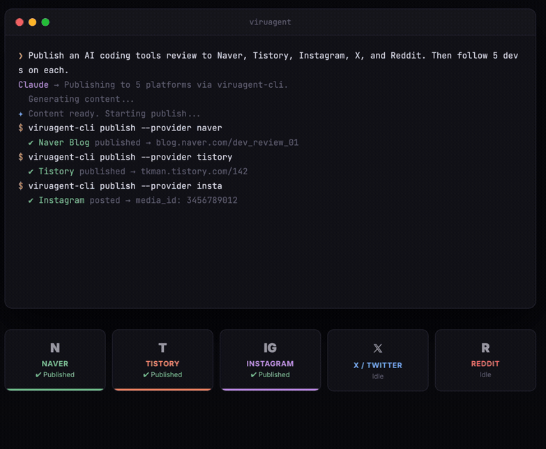 viruagent-cliが自動で各プラットフォームに投稿・フォローまで処理します。